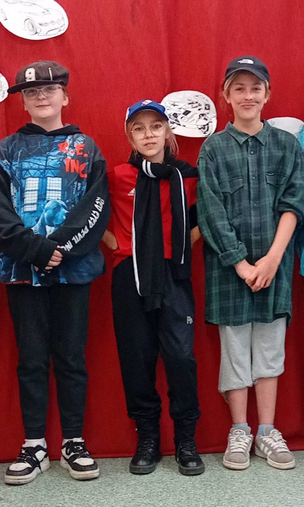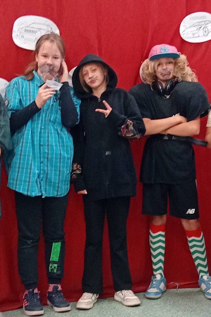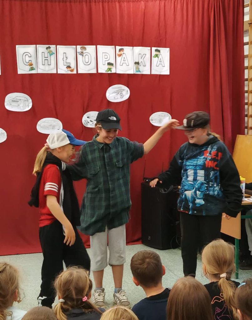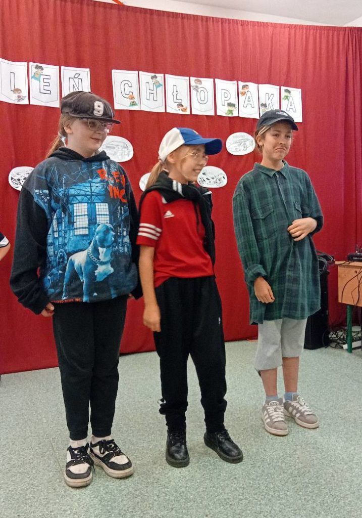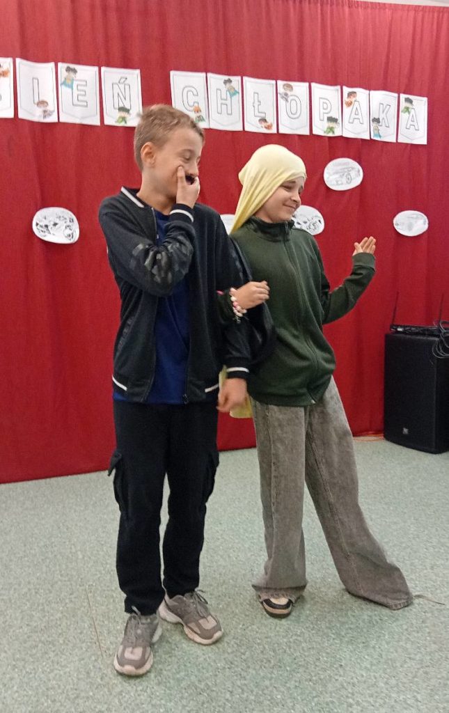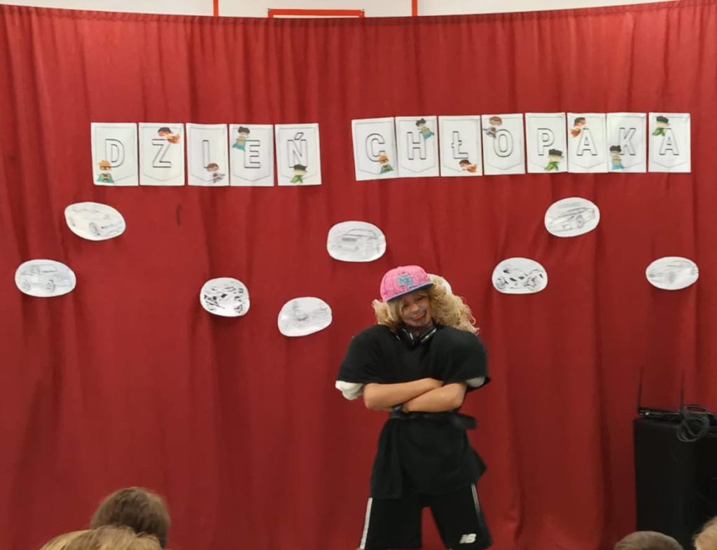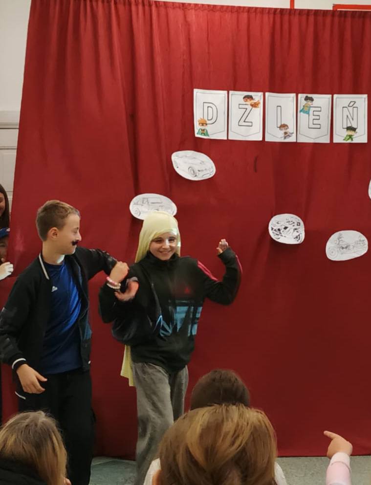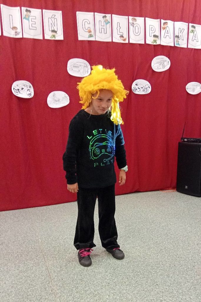 Następnie uczennice klasy 7 zaprosiły wszystkich na spotkanie w sali gimnastycznej, gdzie przygotowały kilka atrakcji, min. pokaz mody męskiej, w którym modelami były dziewczyny, wykonanie portretu najlepszego kolegi oraz mini koncert ulubionych piosenek.