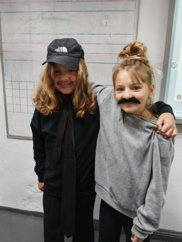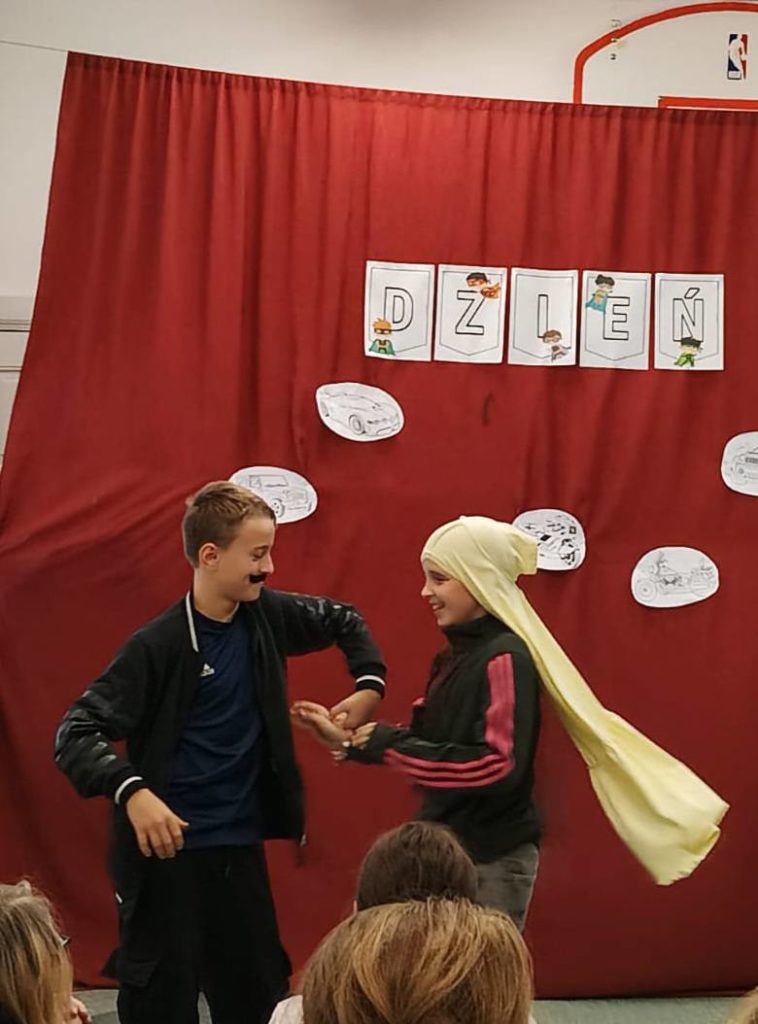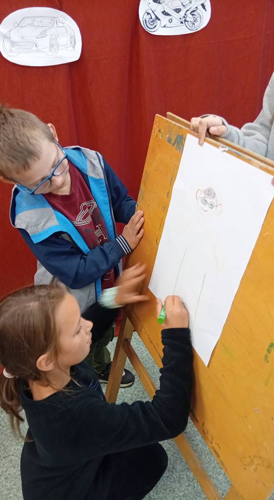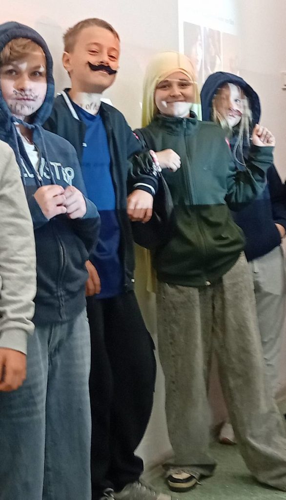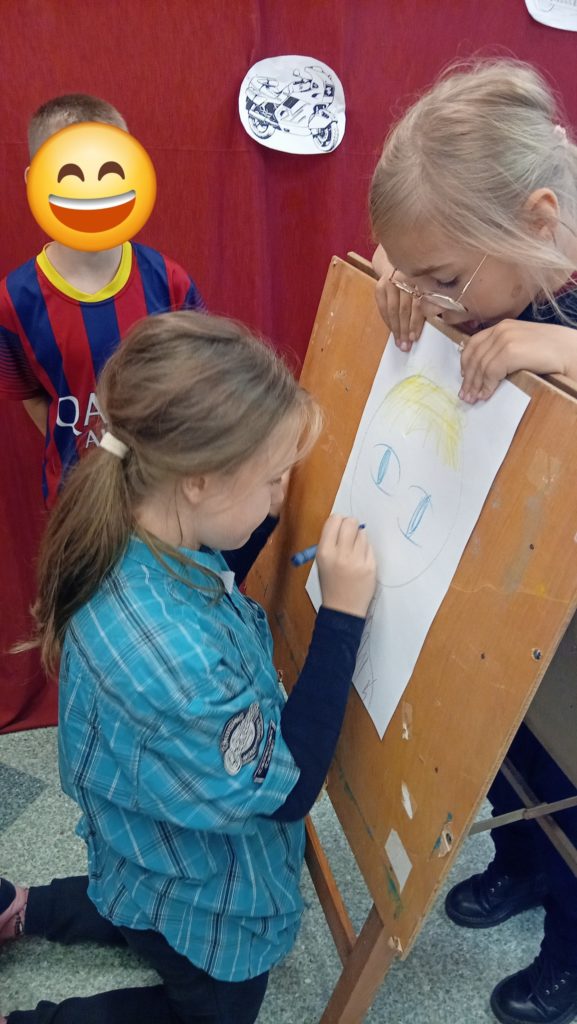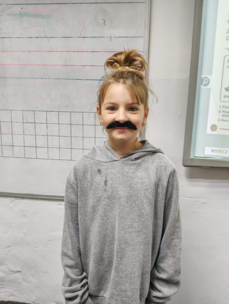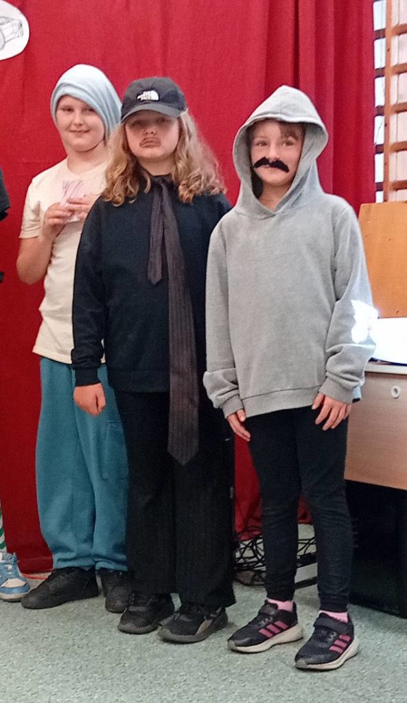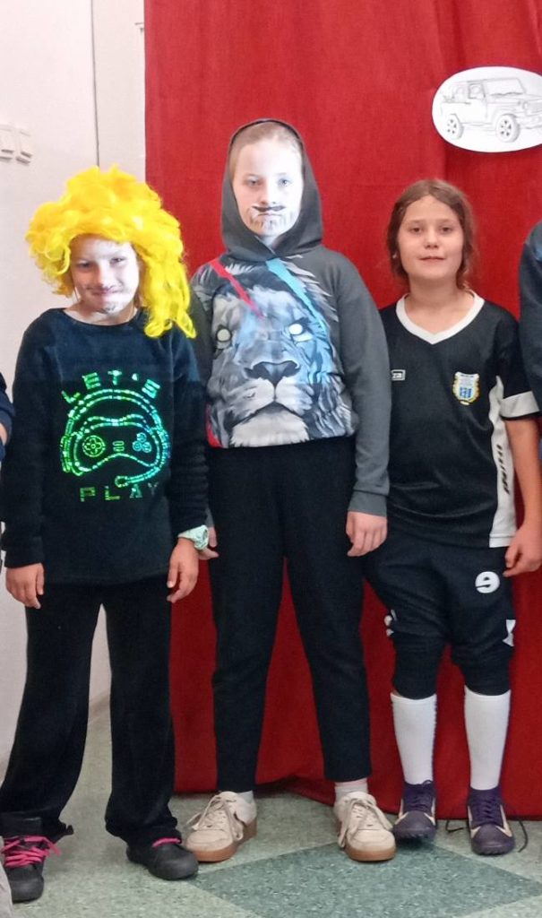 Następnie uczennice klasy 7 zaprosiły wszystkich na spotkanie w sali gimnastycznej, gdzie przygotowały kilka atrakcji, min. pokaz mody męskiej, w którym modelami były dziewczyny, wykonanie portretu najlepszego kolegi oraz mini koncert ulubionych piosenek.