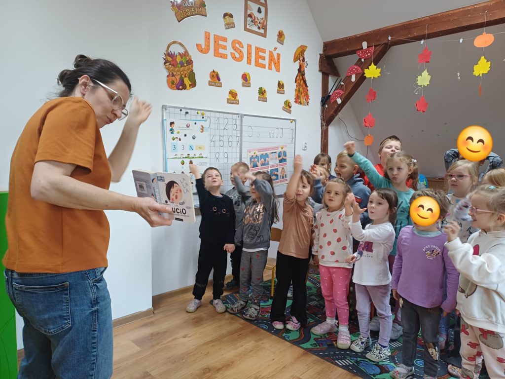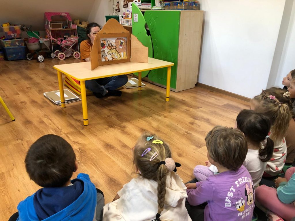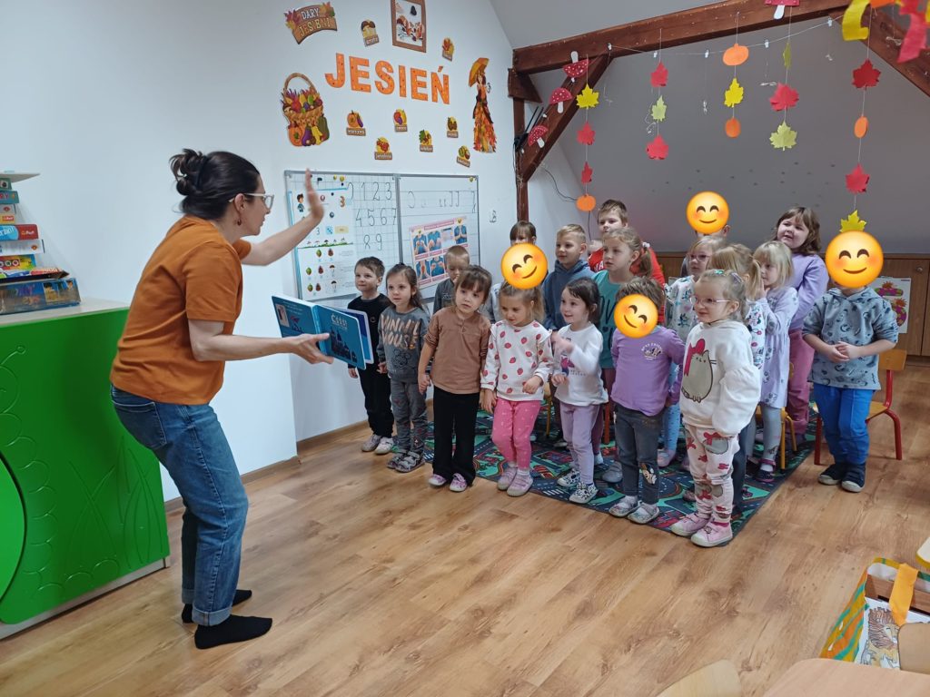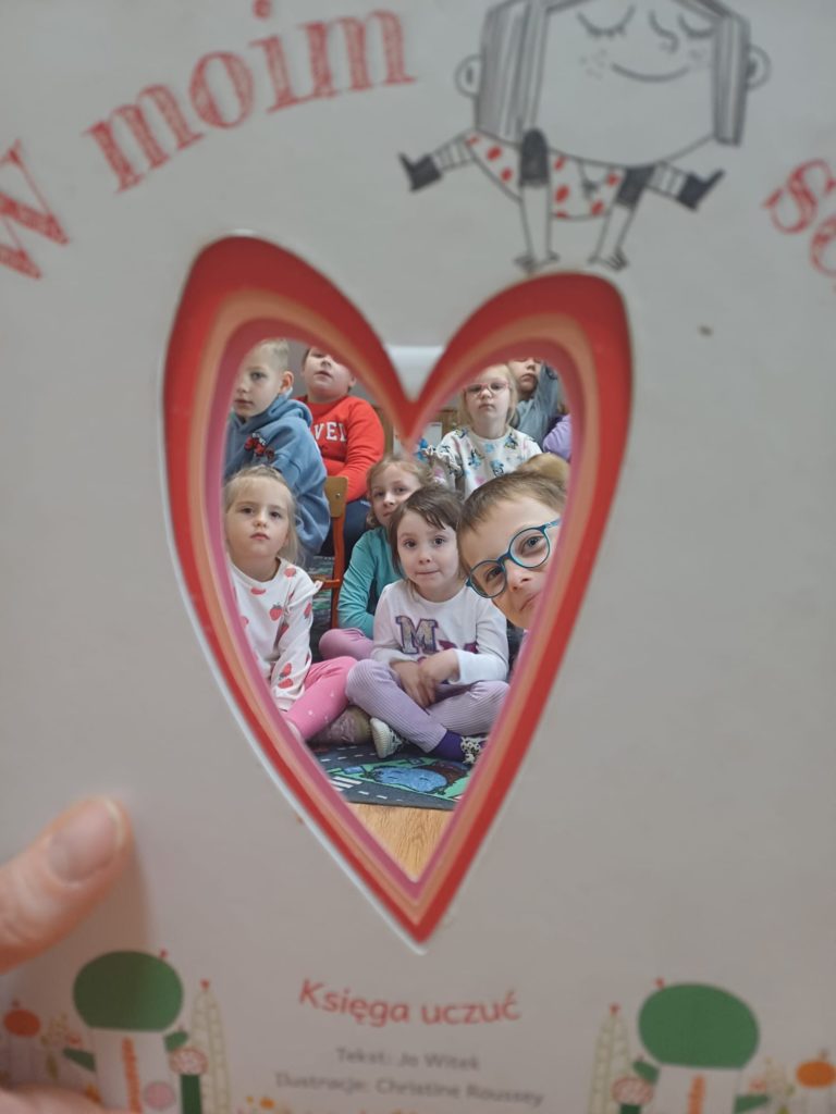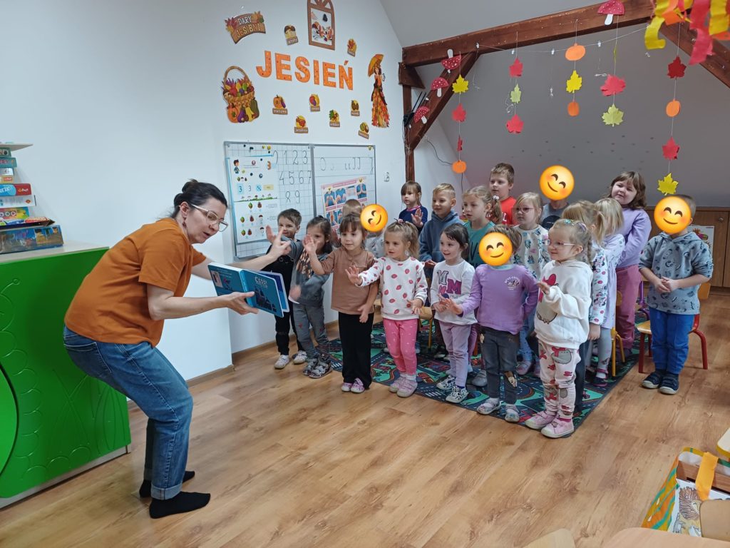Pani Bibliotekarka przygotowała dla przedszkolaków niesamowitą literacką podróż! Wspólnie zanurzyliśmy się w świat kilku króciutkich książeczek. Czytanie metodą wrażeniową to nie tylko słuchanie, ale i przeżywanie historii wszystkimi zmysłami! Na zakończenie czekała nas prawdziwa niespodzianka! Pani Bibliotekarka zaprezentowała Kamishibai (japoński teatrzyk obrazkowy) z książką pt. „Jestem kotem”. Ta niezwykła forma opowiadania wciągnęła i zachwyciała dzieci! Po lekturze był też moment na krótką rozmowę o wrażeniach i przygodach bohatera ostatniej książki.