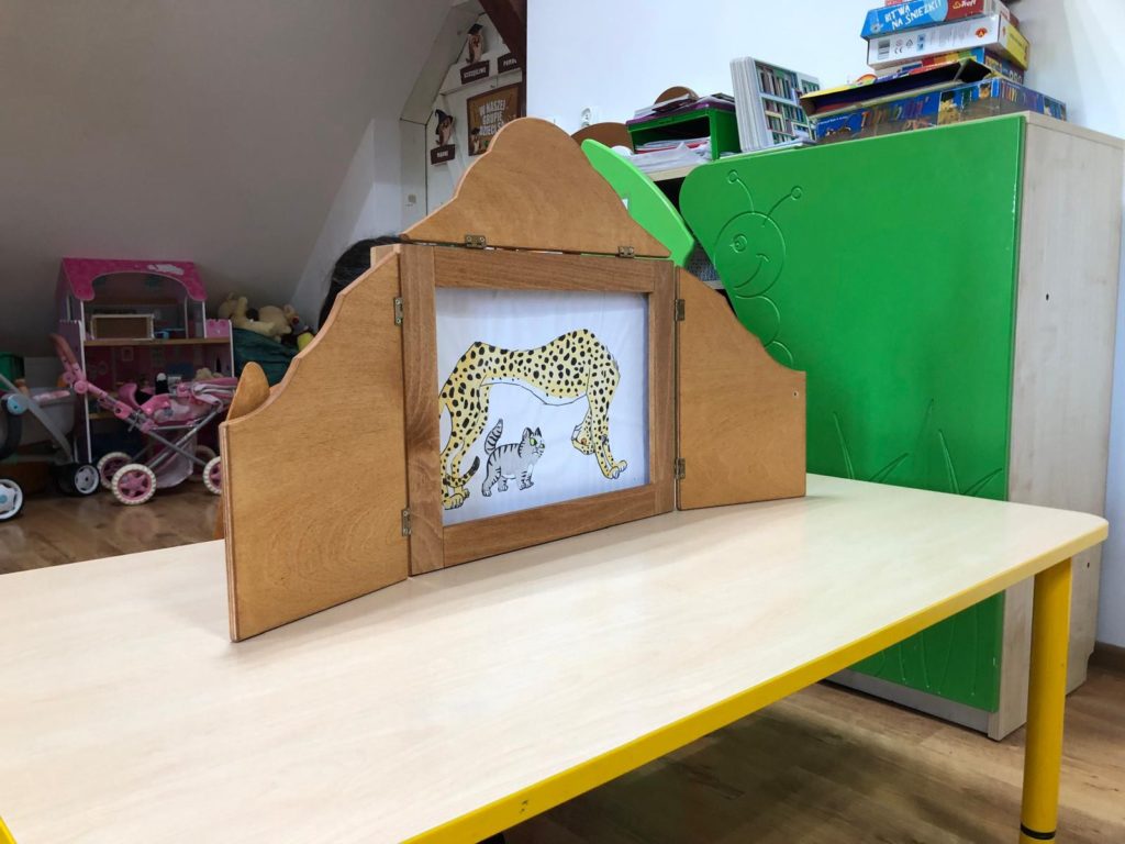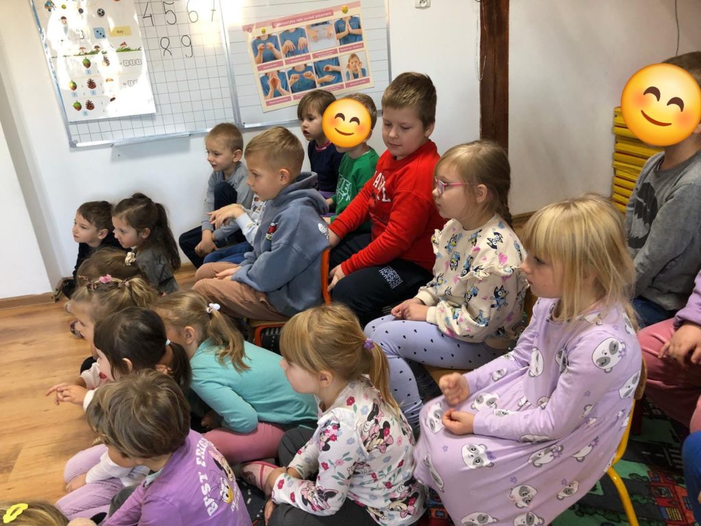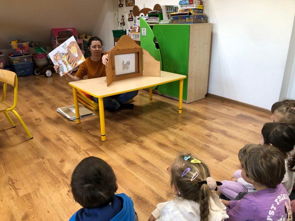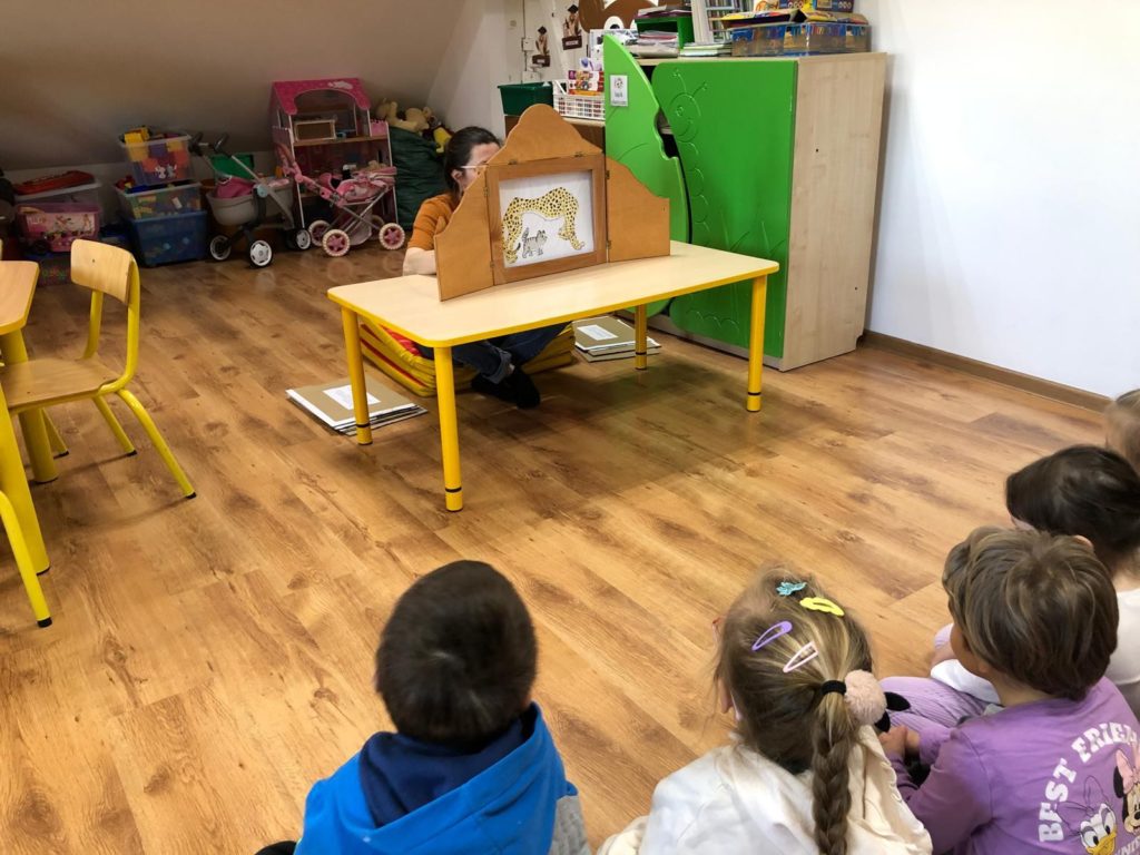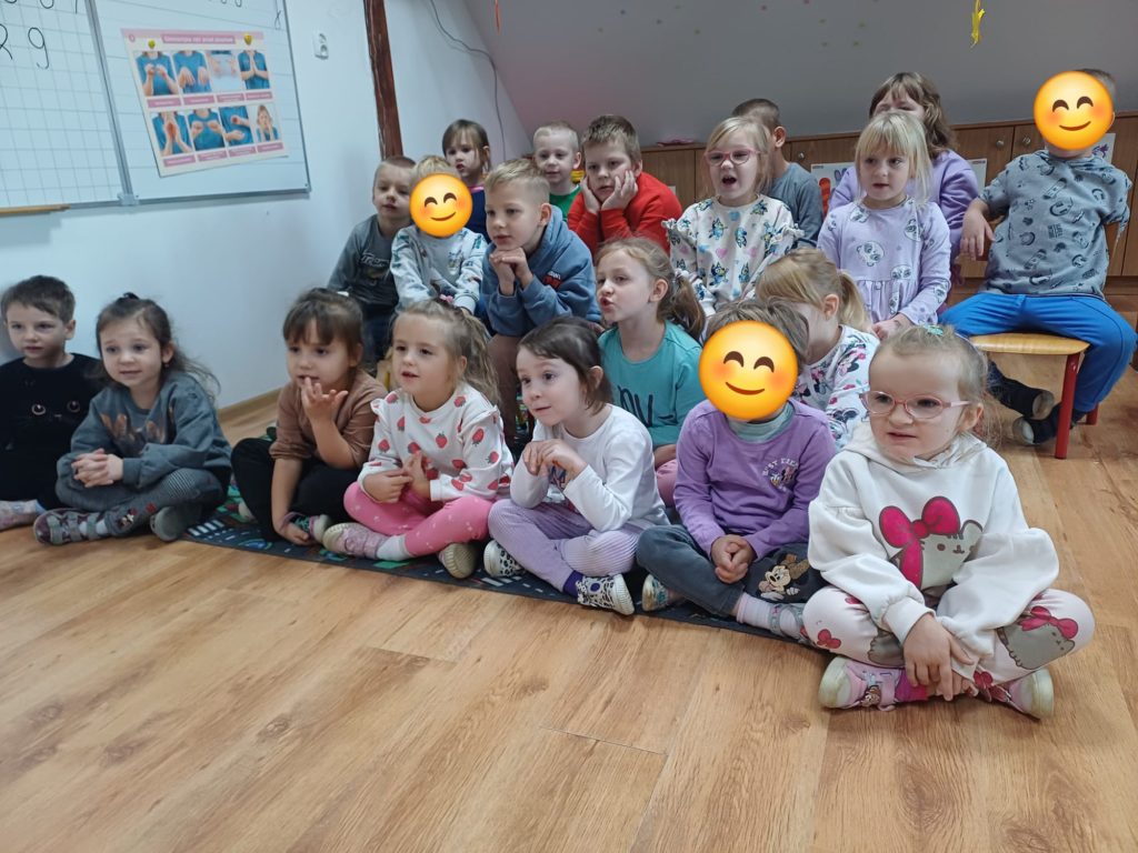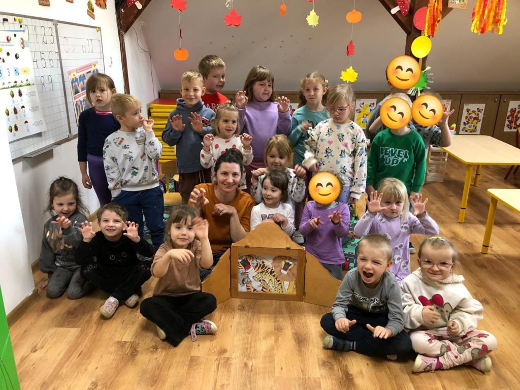 Pani Bibliotekarka przygotowała dla przedszkolaków niesamowitą literacką podróż! Wspólnie zanurzyliśmy się w świat kilku króciutkich książeczek. Czytanie metodą wrażeniową to nie tylko słuchanie, ale i przeżywanie historii wszystkimi zmysłami! Na zakończenie czekała nas prawdziwa niespodzianka! Pani Bibliotekarka zaprezentowała Kamishibai (japoński teatrzyk obrazkowy) z książką pt. „Jestem kotem”. Ta niezwykła forma opowiadania wciągnęła i zachwyciała dzieci! Po lekturze był też moment na krótką rozmowę o wrażeniach i przygodach bohatera ostatniej książki.